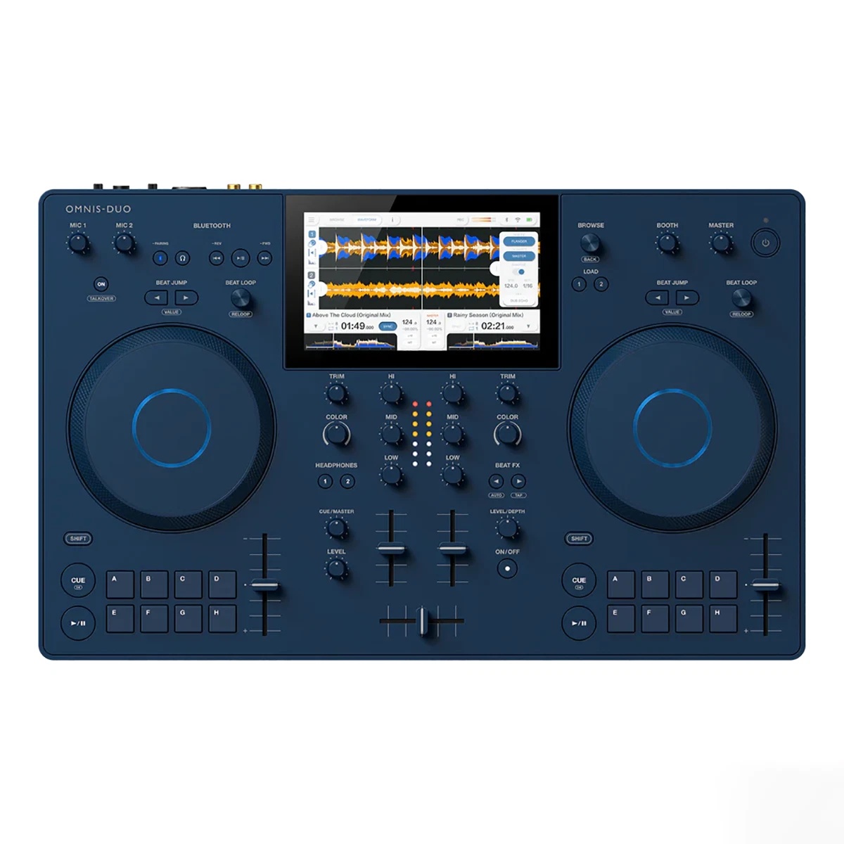 Manufacturer’s DescriptionGrab your DJ setup, gather your friends, find a place to hang out, and get the party started with the OMNIS-DUO. Built to be totally portable, the all-in-one DJ system is lightweight and compact. It’s easy to set up and enjoy an authentic DJ experience in any location – even outside – thanks to the Bluetooth®/MD audio output function, battery power, 2-deck + mixer interface, and touchscreen. There’s no need to take your laptop or cables – whether you want to party at the beach, in a park, or even in a vehicle, there’s no limit. Portability and playability: turn any location into a party venue instantly Easily slide the OMNIS-DUO into a good-sized backpack and carry it anywhere thanks to the compact size, modest weight, and rounded corners. The system’s 2-deck + mixer layout will look familiar to everyone and feel great when you’re DJing. There are 2 modes for the touchscreen – Light and Dark – which you can instantly switch between so you’ll always be able to see the displayed information, even in bright outdoor settings. Built-in battery means no power supply needed and less gear to transport Play for up to 5 hours without plugging into the mains. When it’s time to top up the power, you can connect the AC adapter or plug a compatible power bank (45W or more) into the dedicated USB Type-C terminal. Need to keep the music going? Switching to Eco mode extends the life of the battery and the party. And if you combine the OMNIS-DUO with the new battery-powered WAVE-EIGHT speaker, which features ultra-low-latency SonicLink technology, you can enjoy wireless DJing for total freedom. Flexible audio output options to play anywhere – there’s no limit As the first-ever all-in-one DJ system to feature a Bluetooth audio output function, the OMNIS-DUO opens up brand-new possibilities. Whether you want to play on a campground, at the beach, or even connect to the sound system in a vehicle, there’s no limit to the places you can hold a party. And when the time comes to play in a venue like a bar, you can use the professional XLR output, while the RCA terminals are perfect for plugging in monitor speakers at home. Bluetooth audio input enables the crowd to join in your set Never disappoint a friend again when they request a song. Instead, invite them to connect their phone to the OMNIS-DUO via Bluetooth function and you can drop the track into your set. Thanks to the system’s Bluetooth Playback function, you’ll have control of the audio on the deck. You can adjust the volume and EQ, apply effects to the sound, change the tempo, use Hot Cues, and scratch, just like you would with tracks loaded from a USB stick or SD card. With the OMNIS-DUO and Bluetooth audio input, you can enjoy collaborating with friends and expanding your musical experiences. Support for multiple music sources to suit your DJ style Play your music from almost any source. USB Type-A drives and SD cards can be plugged straight into the OMNIS-DUO, and PC/Mac via the USB Type-C terminal if you want to use Rekordbox Performance mode. The Wi-Fi® function means easy access to tracks on a PC/Mac, smartphone, or the cloud without a wired connection*. *Available with Link Export and the CloudDirectPlay feature in Rekordbox for Mac/Windows or Rekordbox for iOS/Android. Brand-new design that looks great in any environment The OMNIS-DUO looks at home everywhere you take it – from professional events to spontaneous outdoor parties. Its new indigo color is inspired by denim jeans, a classic and hugely versatile fashion item, and the unique curves of the unit create a sleek silhouette. The printing on the top plate is minimal too, helping to create a sophisticated look. Specifications