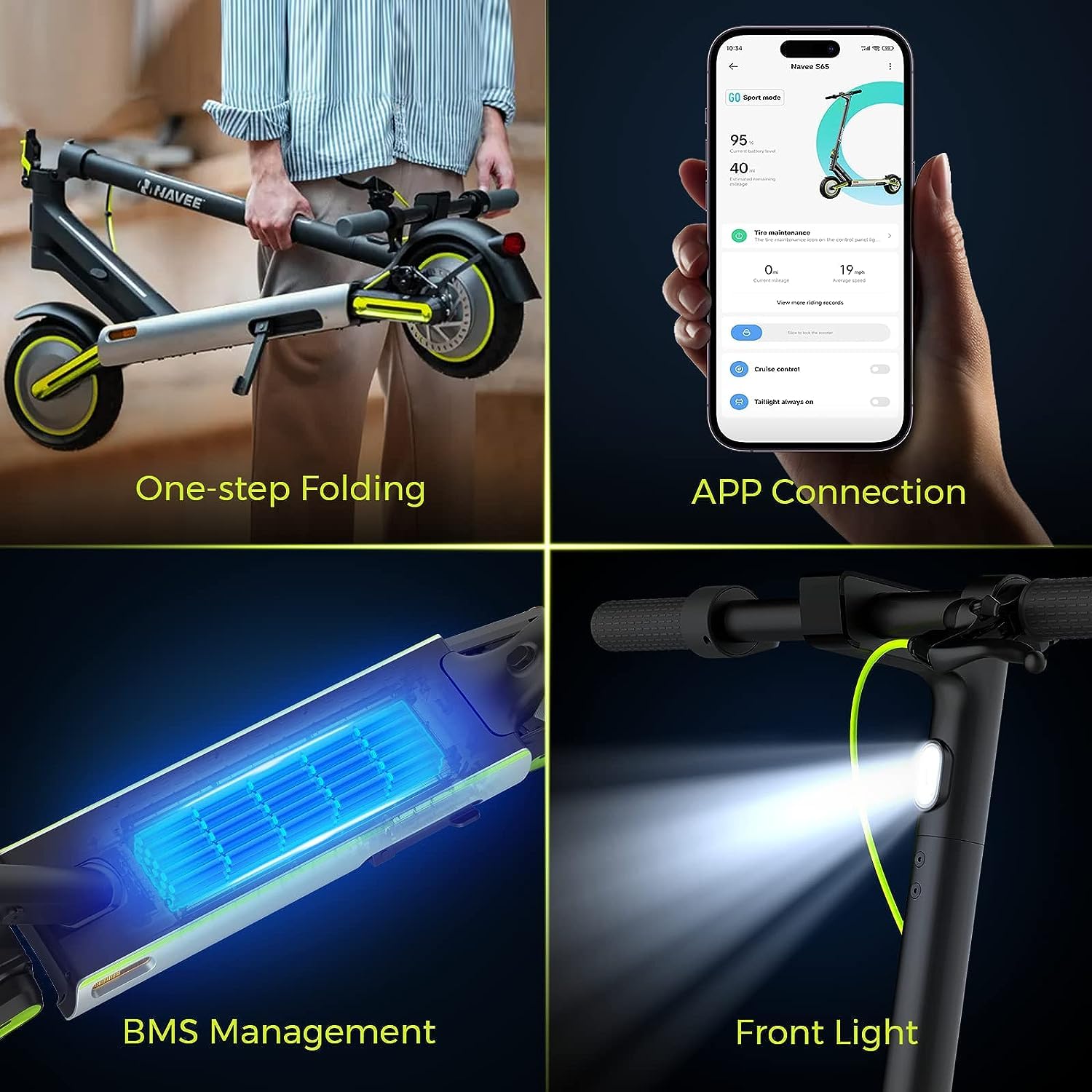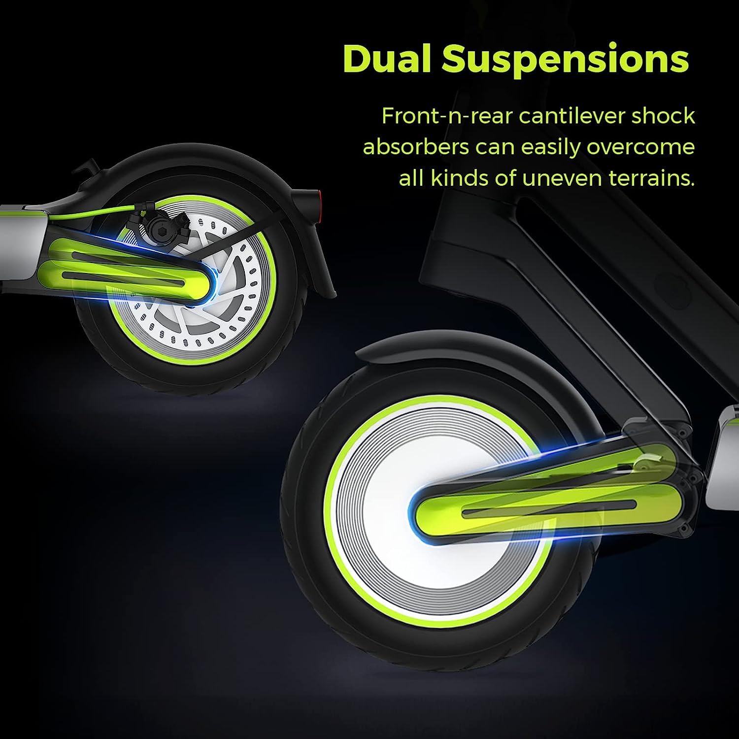 - ๐ดใDual Suspension Systemใ:NAVEE Electric Scooter S65 is engineered with advanced front and rear dual suspension system to deliver unmatched comfort and stability on any terrain. Whether youโre riding on rough roads, uneven pavements, or bumpy trails, the S65 will provide you with a smooth and comfortable riding experience.