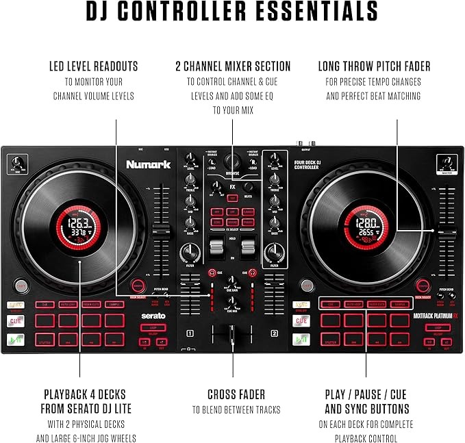 Ready to take on any DJ style and perfect for small events, parties and developing your DJ Skills, the Mixtrack Platinum FX 4-deck Serato DJ controller fuses in-demand functionality with all the tools to craft your signature style – your entry-point into a world of DJ performance starts here!
