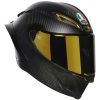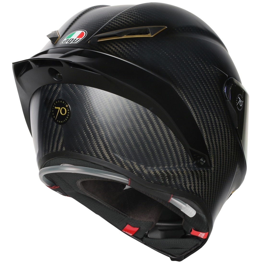 AGV Pista GP R Anniversary /Matte Carbon Limited Edition Helmet. The definitive race helmet designed by AGV is now even better. Outstanding improvements include the hydration system included, the metallic ventilations developed in MotoGP and the wind tunnel tested rear spoiler which improves aerodynamics and stability at high speeds. The outer shell is made 100% of 3K carbon fibre, providing lines which minimise interference with the race suit and its interior with an adjustable fit avoids seams in the more sensitive areas.