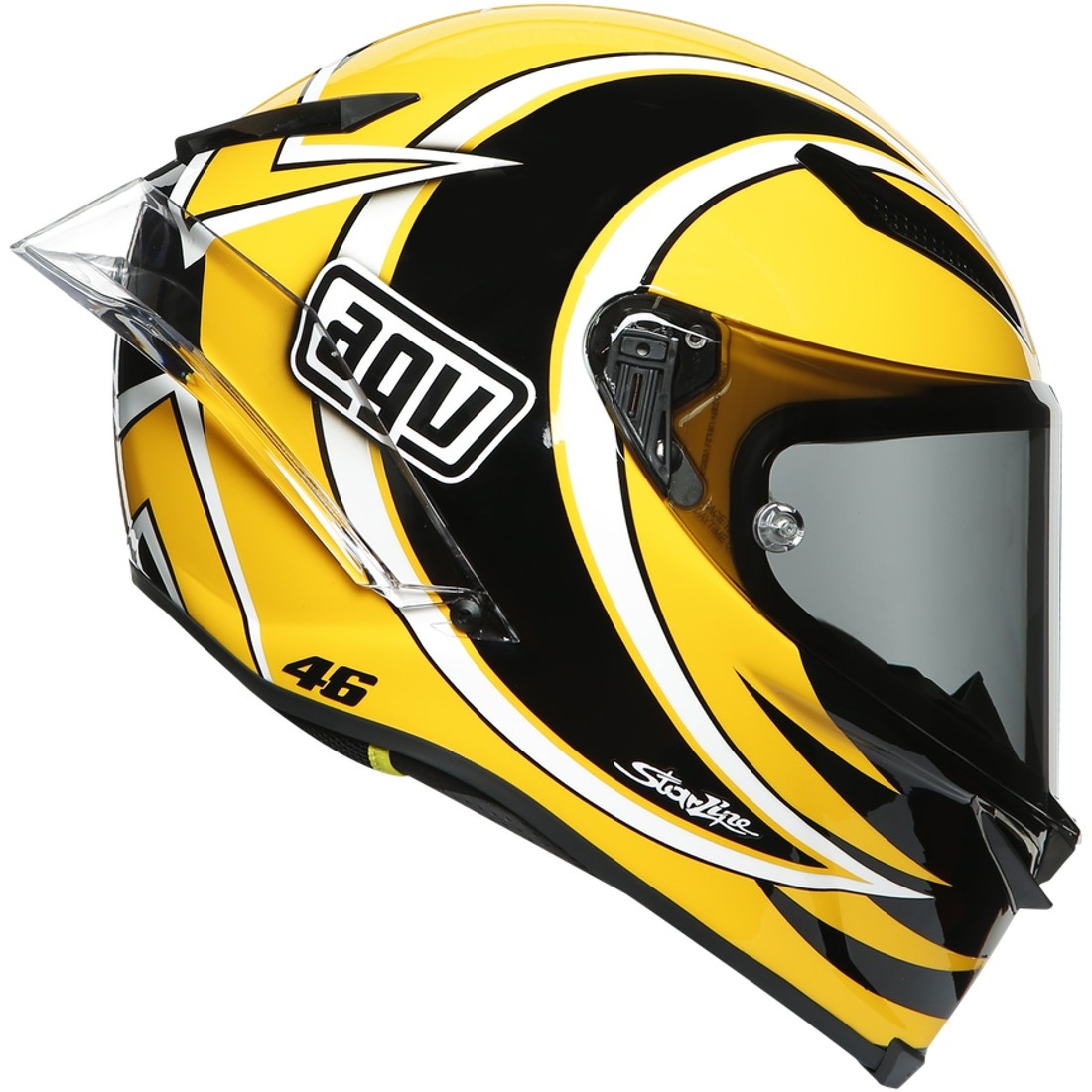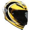 AGV Pista GP RR Rossi Laguna Seca 2005 Limited Edition Helmet. The helmet developed in MotoGP, now available to all riders. It is the same helmet used by professional AGV riders in Moto GP and Superbikes. The Pista GP RR has FIM Homologation, which certifies an unparalleled level of demand in terms of safety and protection. Its 100% carbon fibre outer shell offers lines that minimize interference with the competition suit and its interior with adaptable fit, avoids seams in the most sensitive areas. It has metallic vents developed in MotoGP and a rear spoiler to improve aerodynamic performance and stability at high speed. Every detail has been designed to ensure maximum performance.