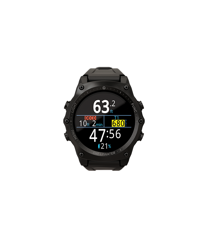 The Teric offers an information screen utilizing a {1.39 in | 35 mm} full color AMOLED display with a { Diameter x Height | 55mm x 18mm } body and { 4.25 oz | 120.4 g } weight. Brightness levels are user adjustable and accessible with just one button press. During a decompression dive, the Teric provides complete information displays of all required stop times. The Teric can provide time-to-surface based on “look ahead” at planned gas switches. Multiple gas definition presets are supported with any combination of oxygen, nitrogen and helium. The Teric will NOT “lockout” after a missed stop or ascent rate violation. After the dive, the Teric communicates via Bluetooth to connect with the Shearwater Cloud dive log manager, which is compatible with MS Windows, OS X, iOS and Android devices, supporting wireless log downloads and firmware updates.